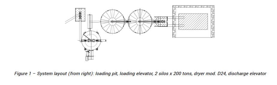 - Ob upoštevanju dnevne proizvodnje približno 125-145 ton/24h (od 25 % do 15 %) posušene in ohlajene pšenice za ta model lahko sušilnica brez težav deluje 24 ur na dan, sveži pridelki pa ostanejo v nakladalnih silosih v povprečju en dan.
