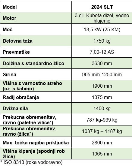 2024 SLT je z višino 1,89 m in minimalno širino 90,5 cm eden najbolj kompaktnih nakladalnikov, ki jih najdete na tržišču.