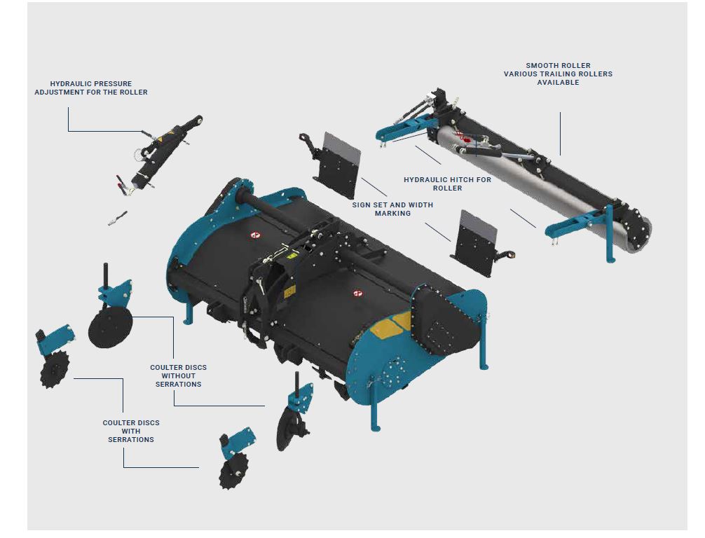 Stroje iz serije 33 SX/WX lahko opremite z najrazličnejšo opremo, ki ustreza vašemu načinu dela. Lahko izbirate med različnimi valji, katerim lahko tudi nastavite globino obdelave, ki jo želite. Da preprečite plazenje organskih ostankov in zelenega gnojila, je lahko model 33 SX/WX opremljen tudi z diski, ki zagotavljajo, da ostanki ostanejo na delovnem območju stroja.