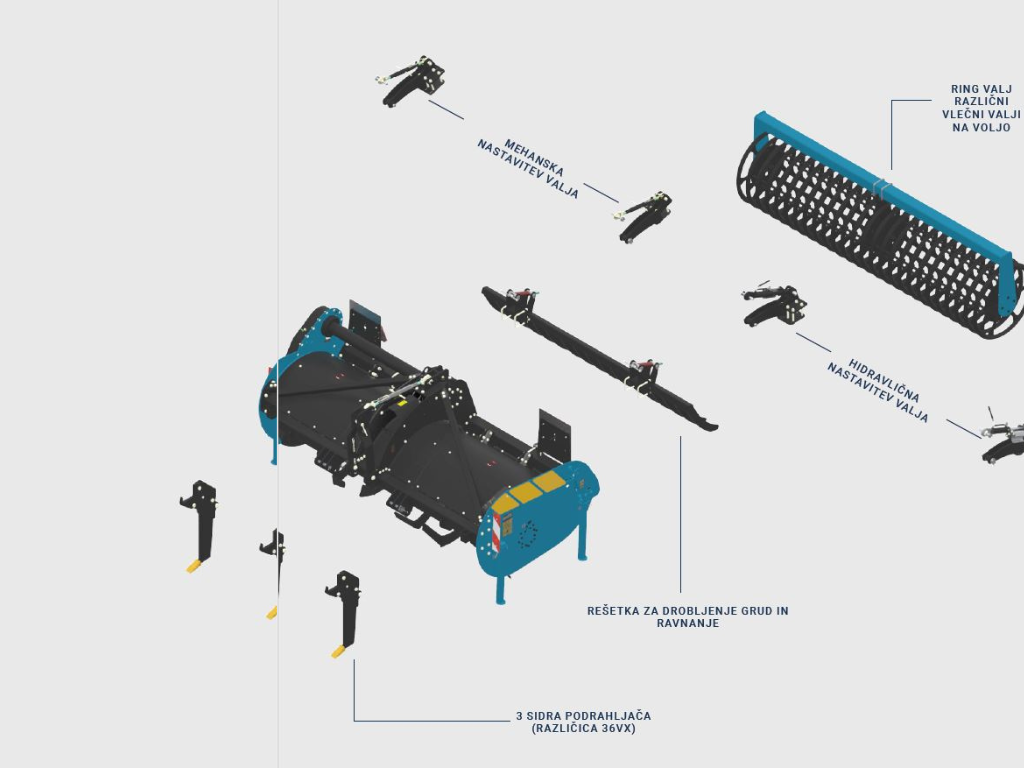 Stroj omogoča primarno obdelavo tal, rahljanje in mešanje zemlje. Z montažo drugih priključkov, kot so brane in sejalnice lahko vse opravite v enem prehodu.