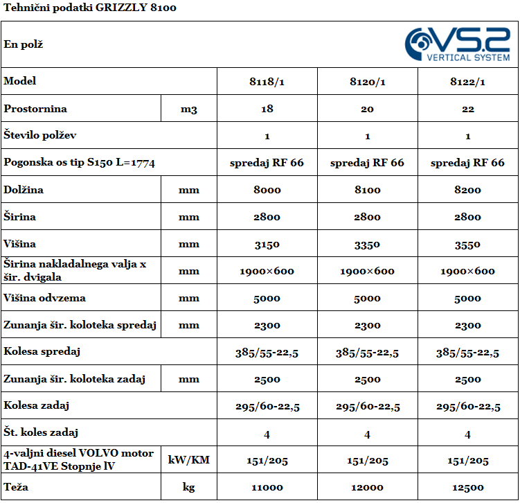 Grizzly 8100 je na voljo s prostornino od 18 do 30 m3 z enim ali dvema vertikalnima polžema ter izpopolni proizvodne zahteve velikih kmetijskih gospodarstev. Na zahtevo je na voljo tudi brez nakladalnega sistema (freze).
