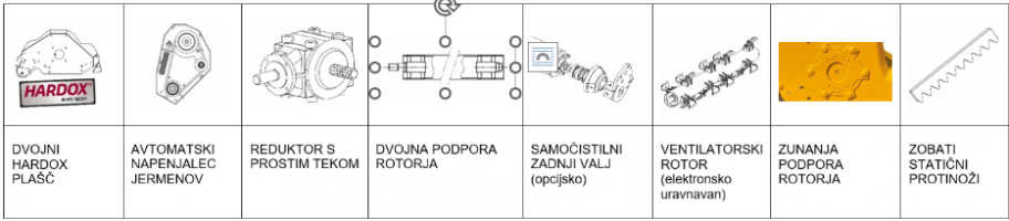 - Delovni elementi pritrjeni na rotor z vijaki M20 kvalitete 12.9
